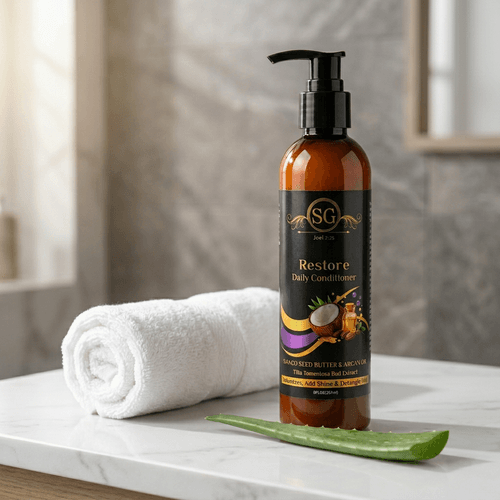 . Restore Daily Conditioner hydrates and strengthens hair. It's loaded with Vegan ingredients like mango seed butter, argan oil and tilia tomentosa bud extract which leaves hair soft, smooth, and manageable, while moisturizing damaged hair. We Infused it with properties that aid in moisturizing hairlocks. It leaves hair shiny and gently detangles. It has a spa scent and doesn't weigh the hair down. Treat your locks to our hydrating conditioner, enriched with premium ingredients like avocado and coconut oil. Our product is free from parabens, cruelty free, eco-friendly, and all vegan. This product is suitable for all hair types, and safe to use on colored treated hair.